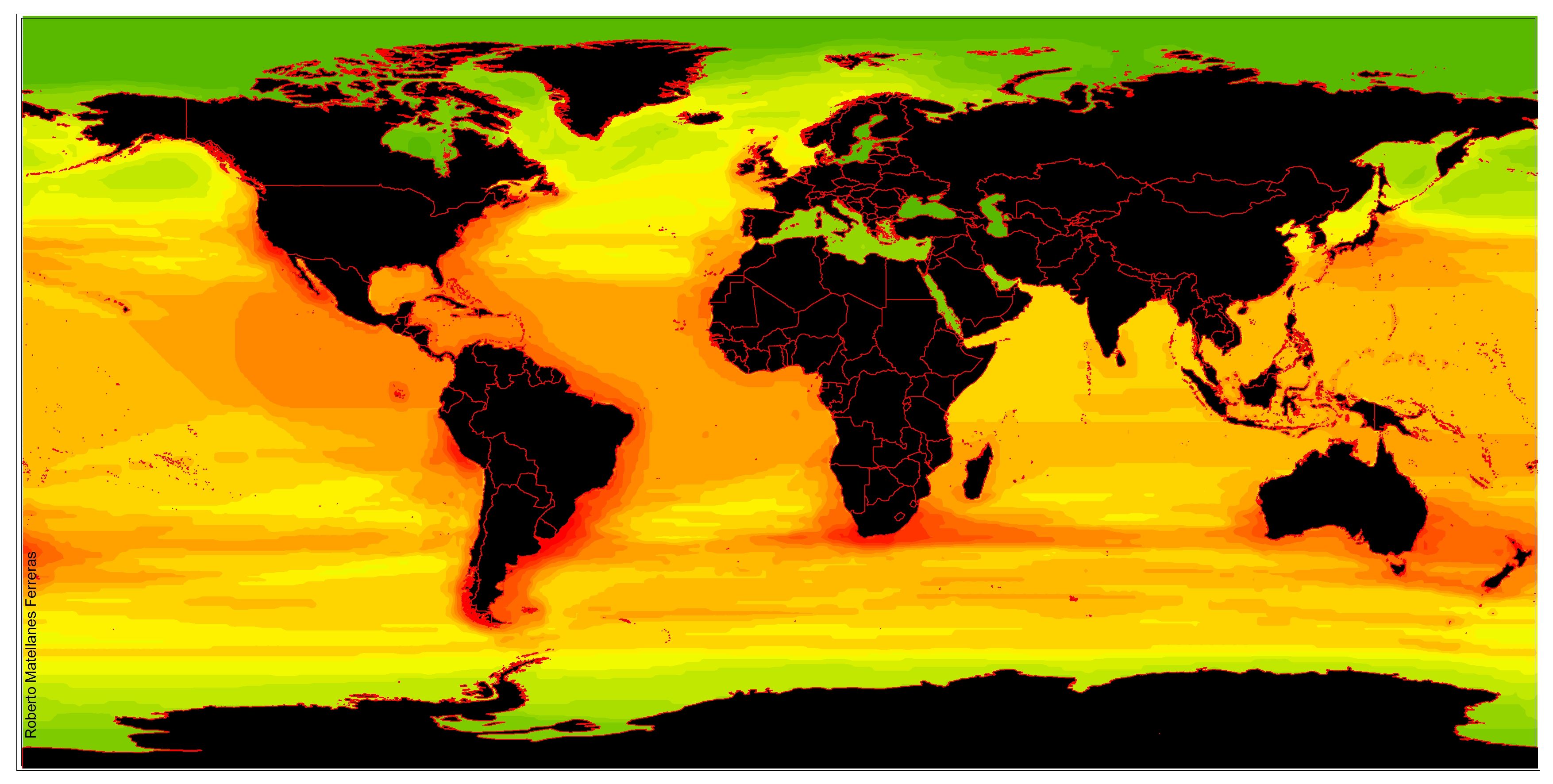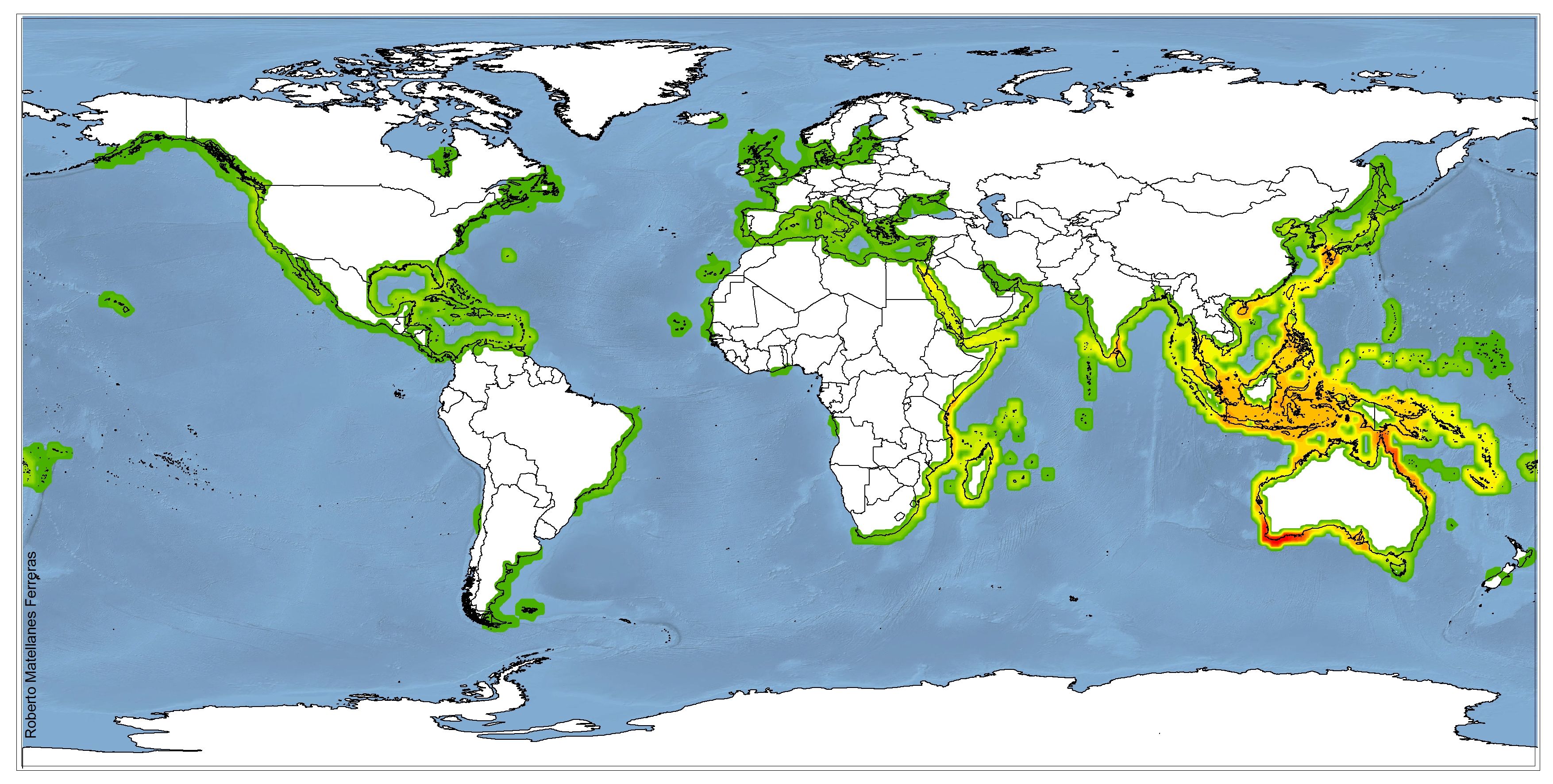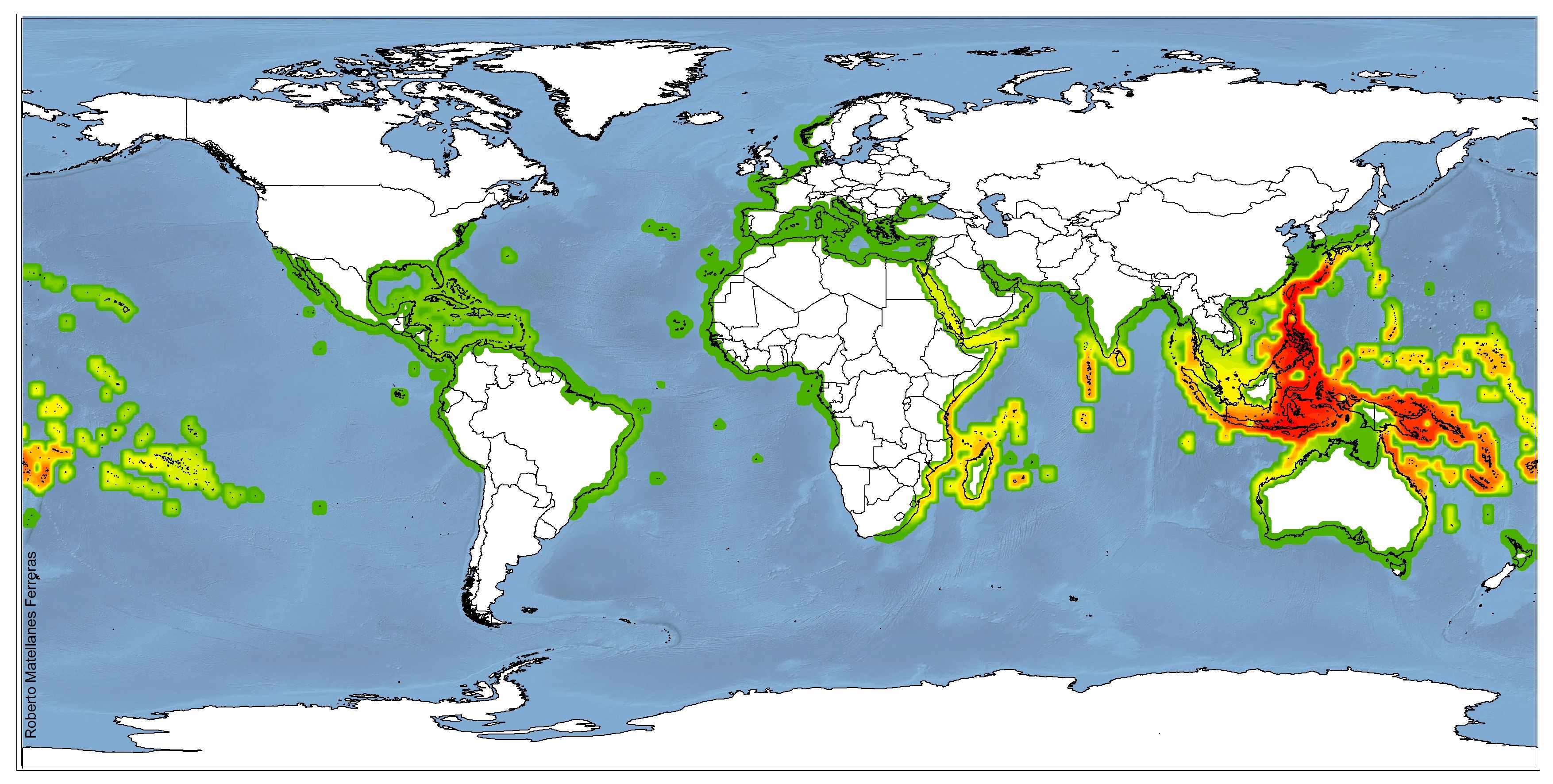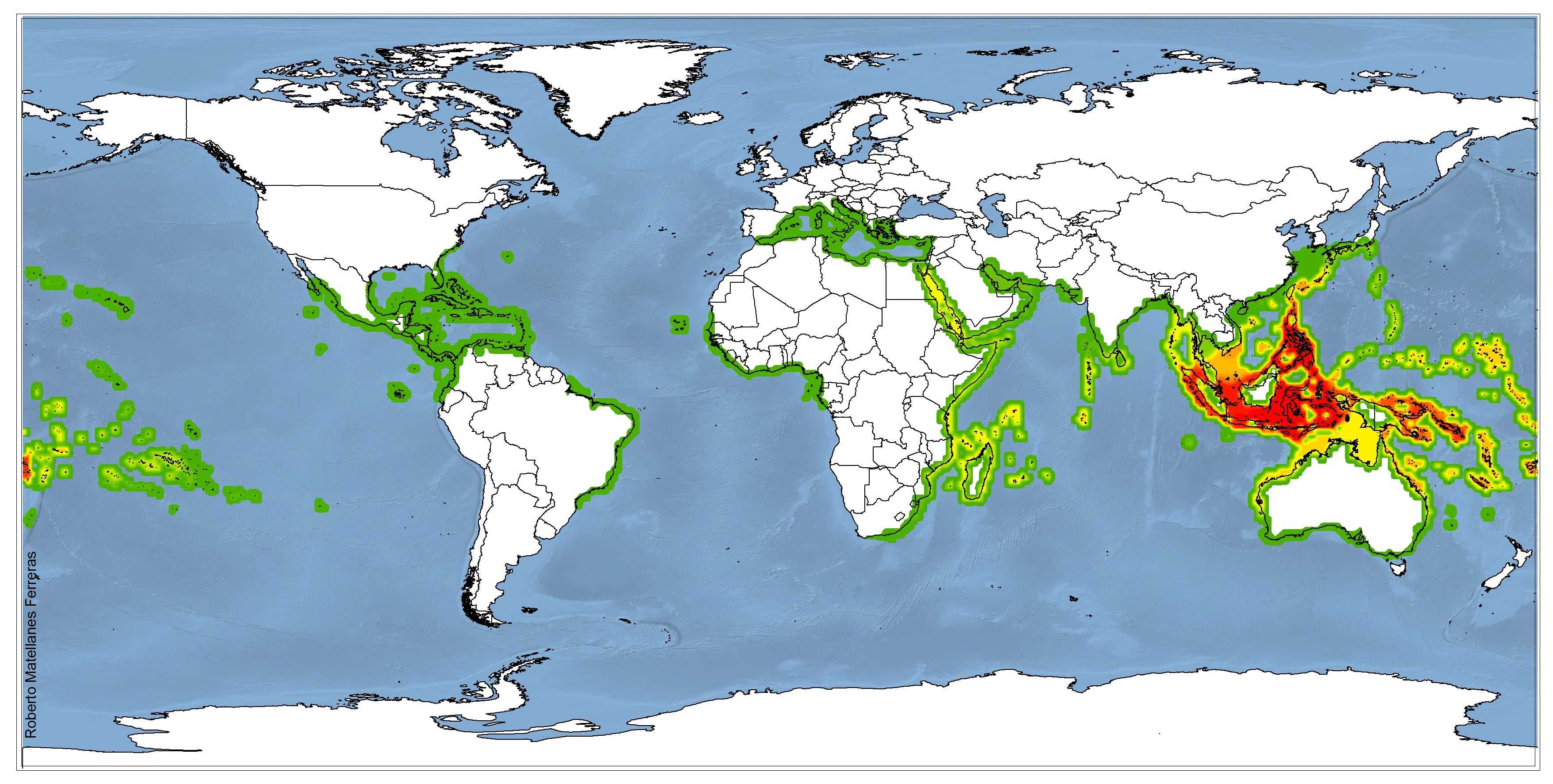 Tomando como base 16.000 especies contempladas por la UICN, he metido sus rangos de distribución en la batidora y he puesto a trabajar a ArcGIS. Las especies convocadas al casting pertenecientes a los grupos de peces, anfibios, reptiles, corales, manglares, praderas marinas y mamíferos.
