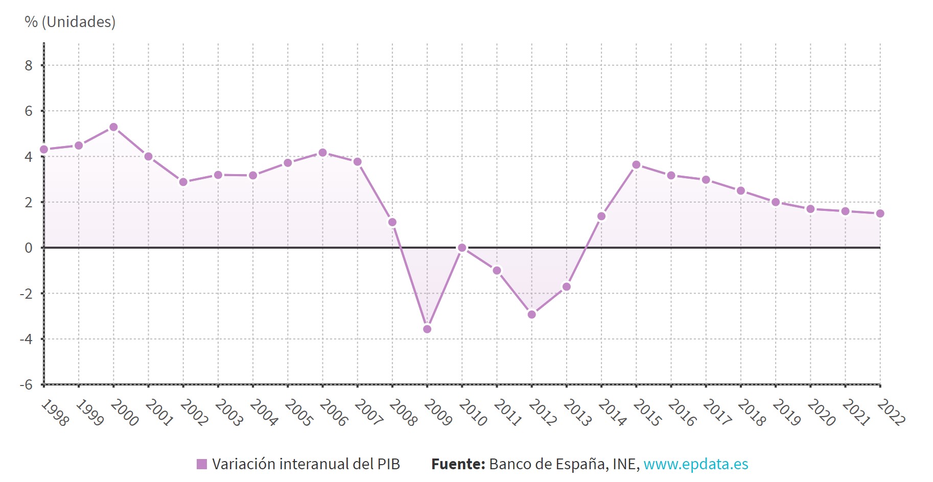 La gráfica presenta la evolución y previsiones del PIB del Banco de España desde los últimos años hasta el 2022. El PIB ha registrado un descenso consecutivo desde el año 2015, pero aun ritmo muy moderado y estabilizado. Por su parte la tasa de paro también muestra un tendencia a la baja, pero a un ritmo considerablemente menor.