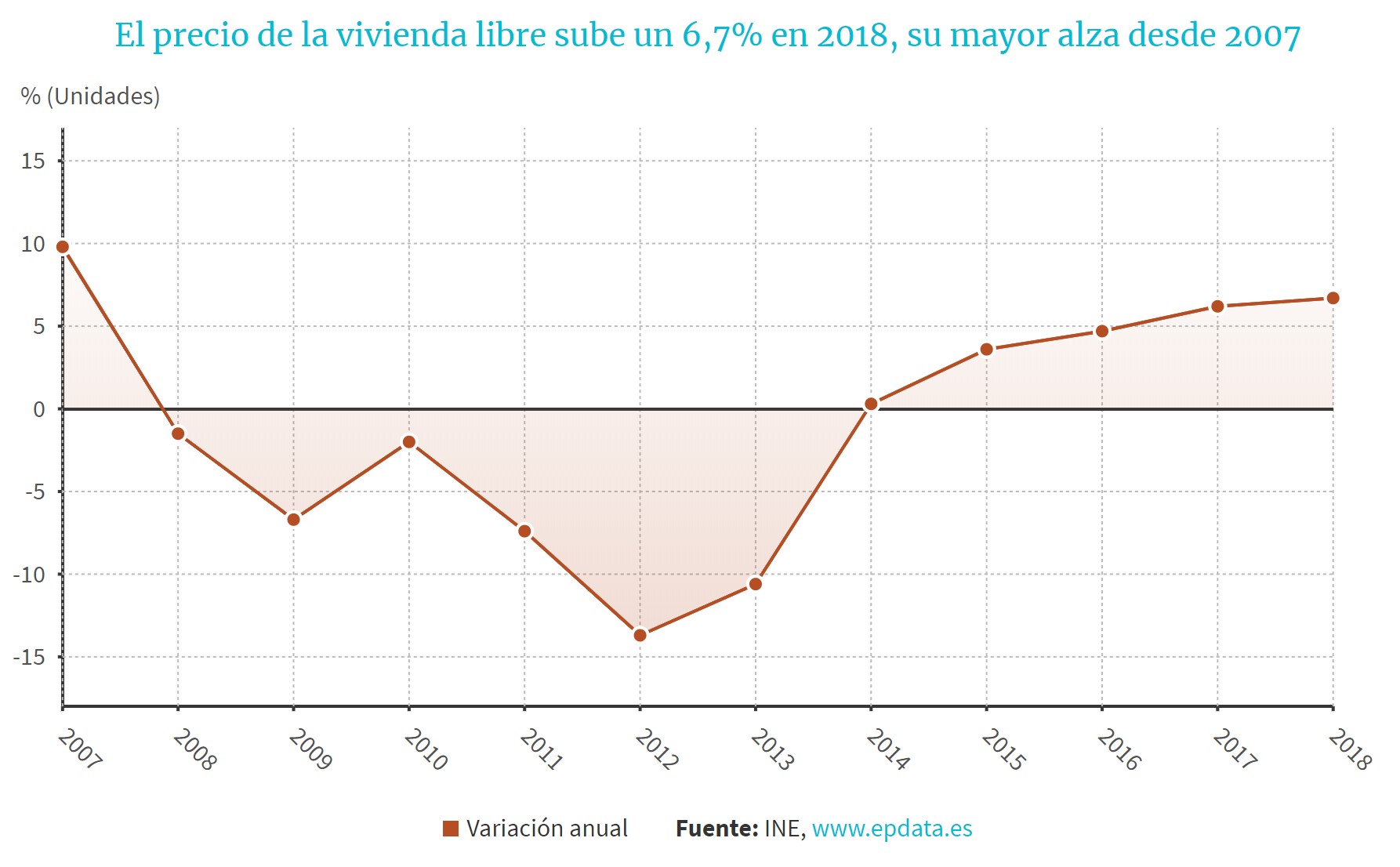 La evolución del número de transacciones de compraventa realizadas en los últimos años, muestra una tendencia alcista desde el final de la crisis, así como la evolución del precio de la vivienda, que registra su máxima subida en 2018 desde el año 2007.