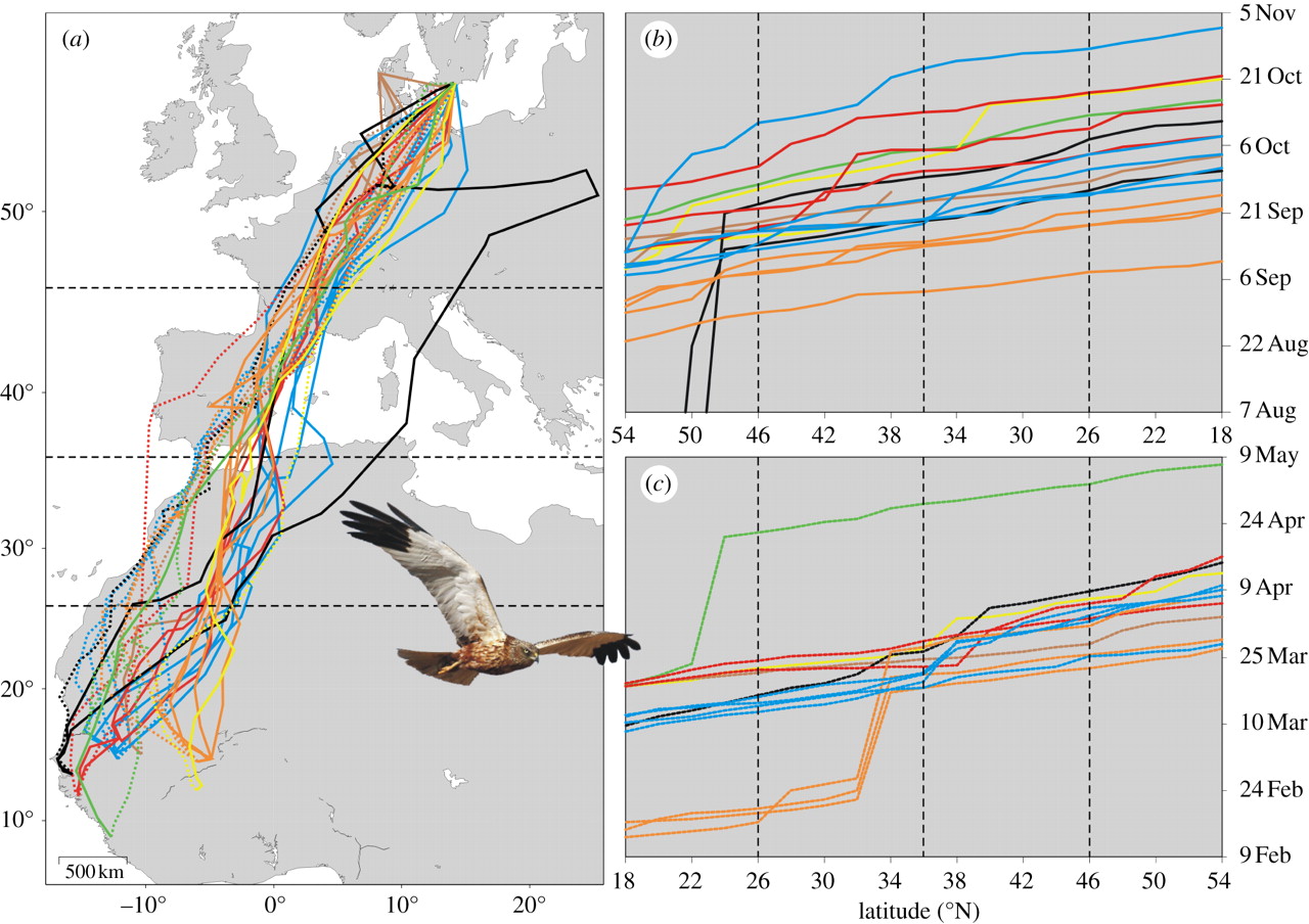 Datos de satélite de los movimientos migratorios de 7 adultos de aguilucho lagunero (Circus aeruginosus). Fuente: Vardanis et al. 2011. Biology Letters 7(4): 502–505.