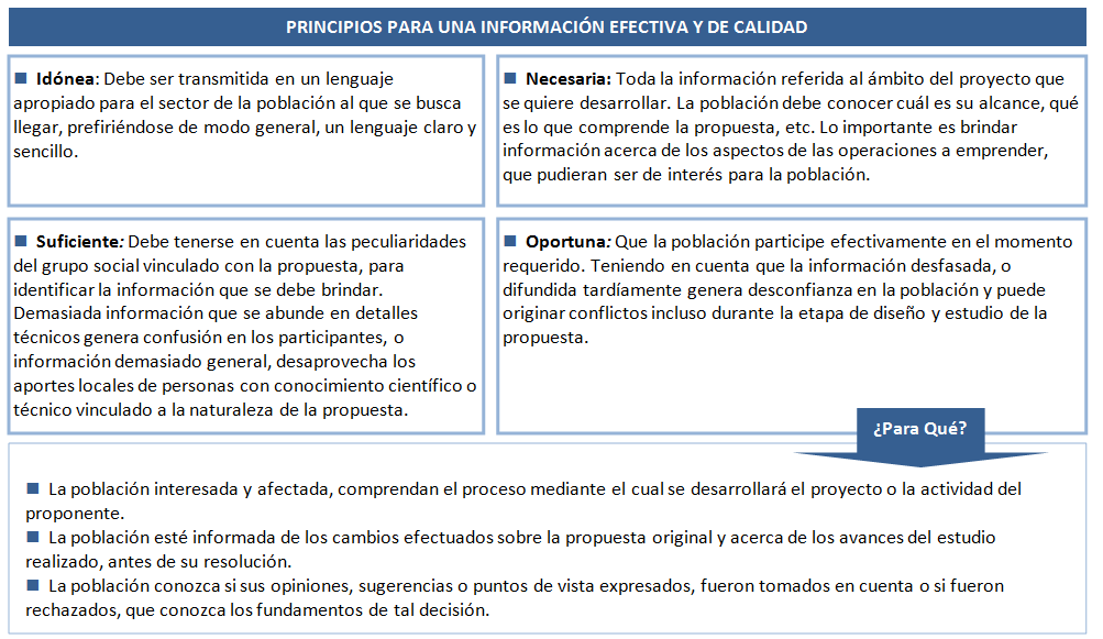 En cualquier proceso de participación la información debe ser: idónea, necesaria, suficiente y oportuna. Con objeto que los ciudadanos puedan formar sus puntos de vista respecto al proceso sobre bases reales, desterrando prejuicios o concepciones erróneas, fruto del desconocimiento o el conocimiento parcial de la propuesta.