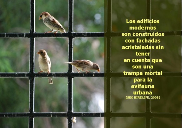 Varios estudios indican que las grandes cristaleras de centros comerciales, edificios o naves industriales e instalaciones deportivas, así como los paneles de aislamiento del ruido que provocan los coches en las autopistas, autovías o el ferrocarril, traen aparejado la muerte de un elevado número de aves que, incapaces de verlas, chocan violentamente con ellas. Lo más normal es que estos choques produzcan grandes daños internos, provocándoles finalmente la muerte. Solo en algunos casos, las aves chocan y quedan aturdidas durante un corto periodo de tiempo, recuperándose después. Asimismo, American Bird Conservancy señala que la razón por la que el vidrio plantea una triple amenaza para las aves es que: