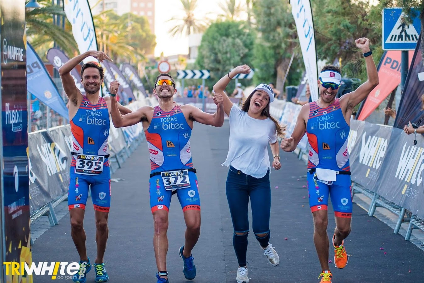 Mi amigo @NachoTomas y sus hermanos entrando en meta y completando Triatlones como quien pasea a orillas del mar
