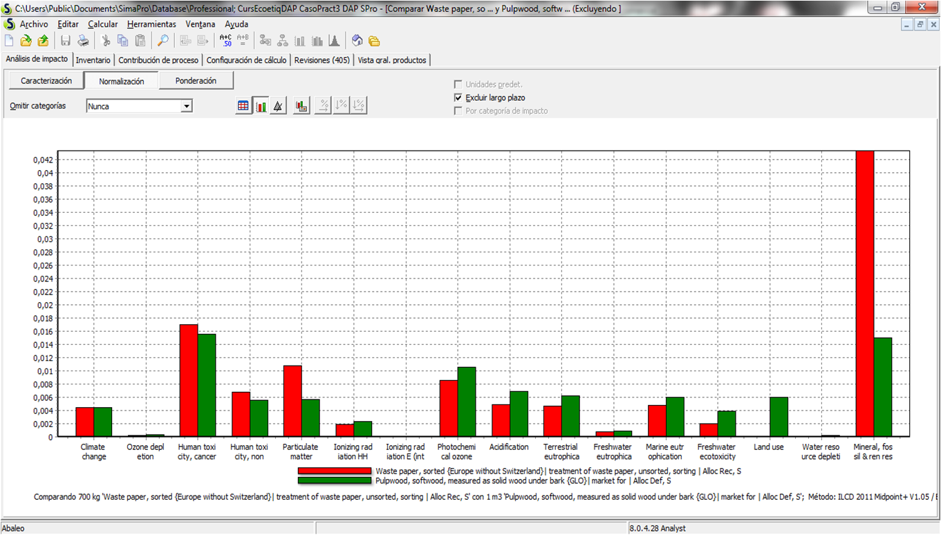 Como puede verse en la gráfica (en la que presentamos la fase de normalización de la evaluación de impactos), hay categorías de impacto que son más favorables a la obtención de la madera de una explotación forestal (columna verde) y otras que muestran como preferible el reciclado de papel usado (columna roja).
