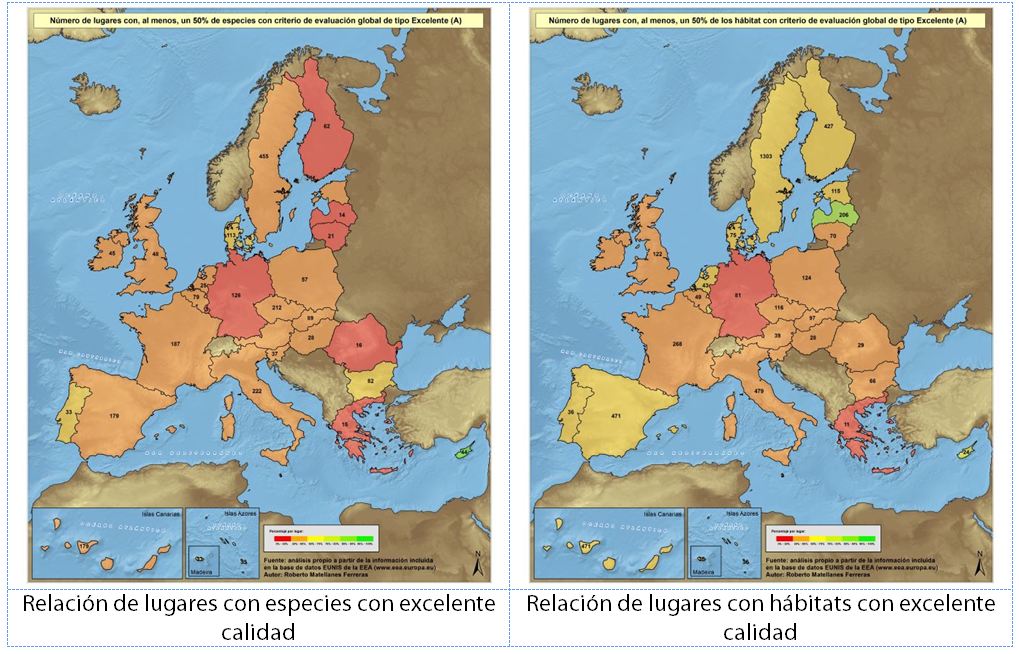Hemos de ser algo realistas. No todos los países disponen del mismo número de lugares, por lo que la relación entre la calidad y la cantidad puede ser malinterpretada. Sin embargo esta relación tampoco da mucho juego al optimismo. Sólo Chipre presenta un número de espacios con elevada calidad para sus especies presentando 44 de sus 61 espacios con, al menos, un 50% de sus especies con tipología Excelente. Letonia presenta 206 de sus 332 espacios con, al menos, un 50% de sus hábitats con tipología Excelente.