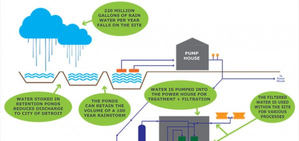 El proyecto desarrollado por General Motors ha preparado en la planta tres estanques, para tener la capacidad de recoger el agua de lluvia que cae sobre ella, hasta la cantidad correspondiente a un período de retorno de 100 años. Desde allí el agua es bombeada hasta la planta de tratamiento, donde se pasa por unos filtros de arena.
