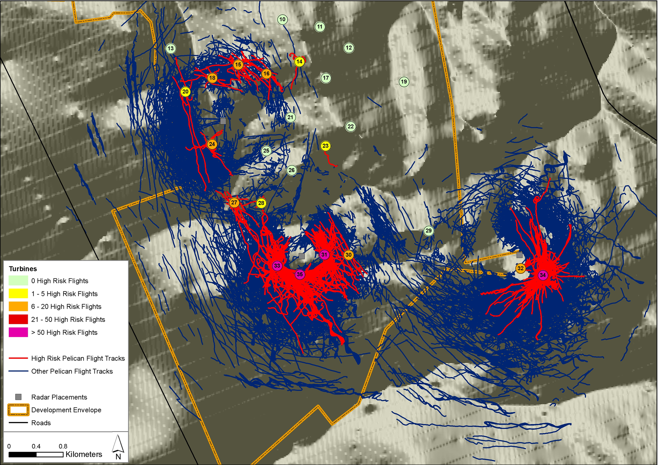 Registro de radar de los vuelos de pelicano común en la zona de estudio y análisis de las áreas de riesgo de colisión. Fuente: Jenkins et al. 2018. PLoS ONE 13(2): e0192515.
