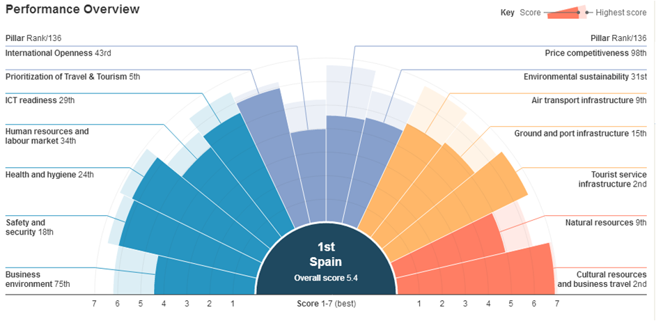 El éxito de España, según el estudio, se debe a su oferta única tanto de recursos culturales (2º) como naturales (9º), combinados con una sólida infraestructura de servicios turísticos (2º), conectividad del transporte aéreo (9º) y un fuerte apoyo político (5º). Pero, así mismo, el reporte muestra que España tiene una debilidad y es la Sostenibilidad Ambiental (31º); ámbito que es liderado por Suecia, Austria y Noruega.