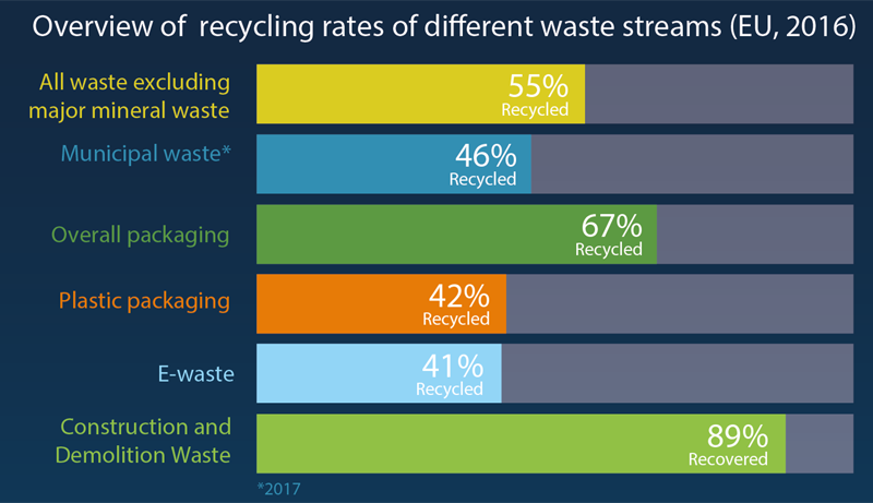 En general, la UE recicló alrededor del 55% de todos los residuos, excepto los principales residuos minerales en 2016 (en comparación con el 53% en 2010). La tasa de recuperación de residuos de construcción y demolición alcanzó el 89% (2016).
