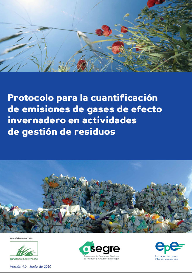 Protocolo de cálculo de emisiones de gases de efecto invernadero en las actividades de gestión de residuos -EpE Protocol-, desarrollado por la Asociación de Empresas Gestoras de Residuos y Recursos Especiales (ASEGRE) con el apoyo de la Fundación Biodiversidad, dentro del proyecto “Gestión de Residuos: Contribución a la Reducción de Emisiones de Gases de Efecto Invernadero”.