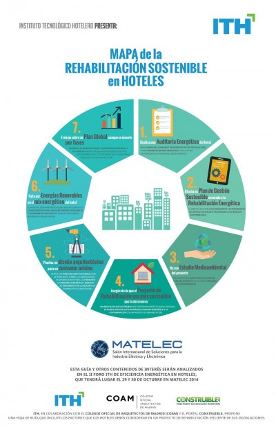 El Instituto Tecnológico Hotelero en colaboración con el Colegio Oficial de Arquitectos de Madrid. COAM, y el portal CONSTRUIBLE, propone una hoja de ruta que incluye los factores que los hoteles deben considerar en un proyecto integral de rehabilitación eficiente y sostenible..