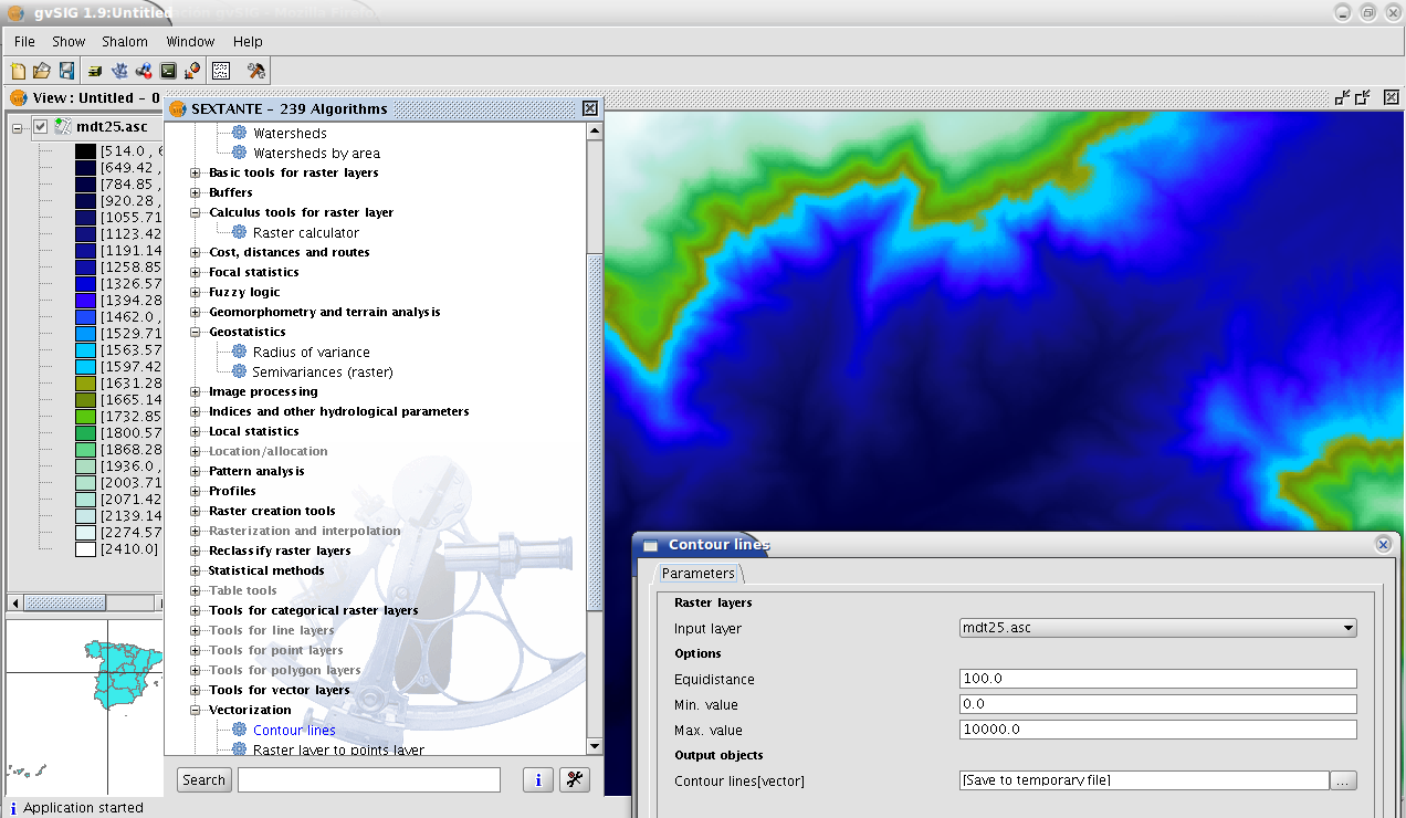 SEXTANTE es una biblioteca de algoritmos de análisis espacial de código libre que se integra como una extensión en gvSIGDesktop