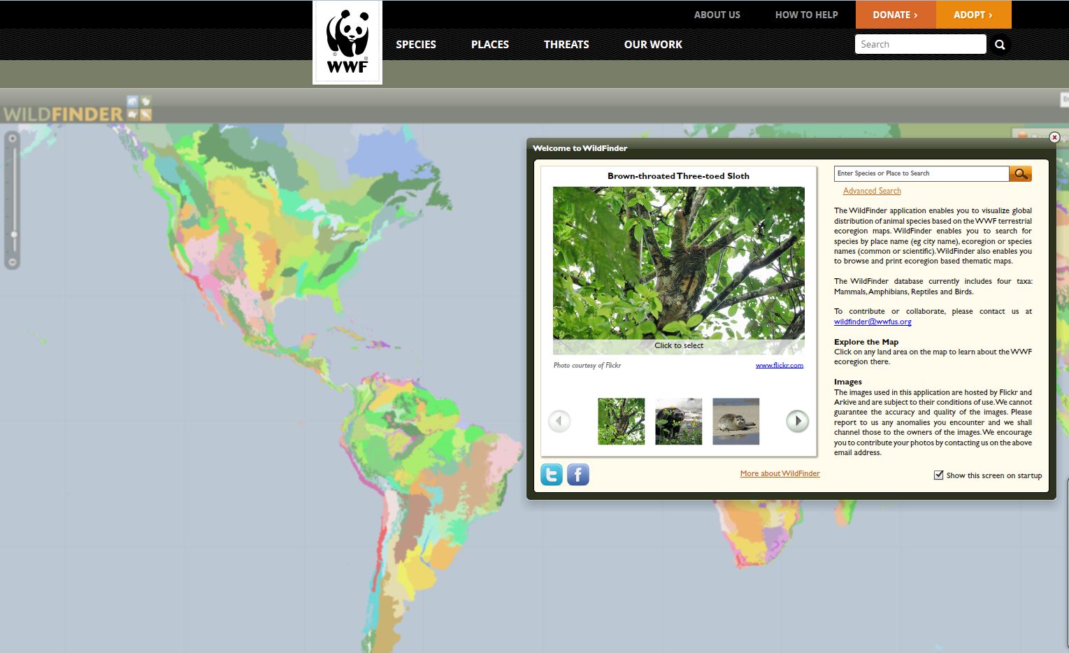 Wildfinder es un visor cartográfico publicado en la web de WWF (World Wildlife Fund for Nature) que nos muestra la localización y distribución de más de 26.000 especies animales que a día de hoy habitan en la Tierra.