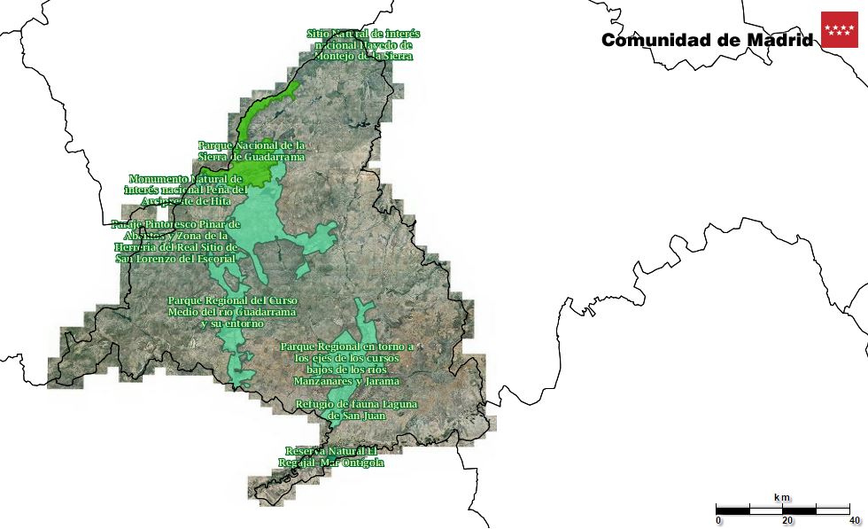 Si reducimos el ámbito de referencia a nivel de Comunidad Autónoma, me centro en la Comunidad de Madrid pues es a la que pertenezco, existen en la actualidad 10 espacios naturales protegidos gestionados por la Consejería de Medio Ambiente, Vivienda y Ordenación del Territorio, que ocupan un 13% de la superficie total.