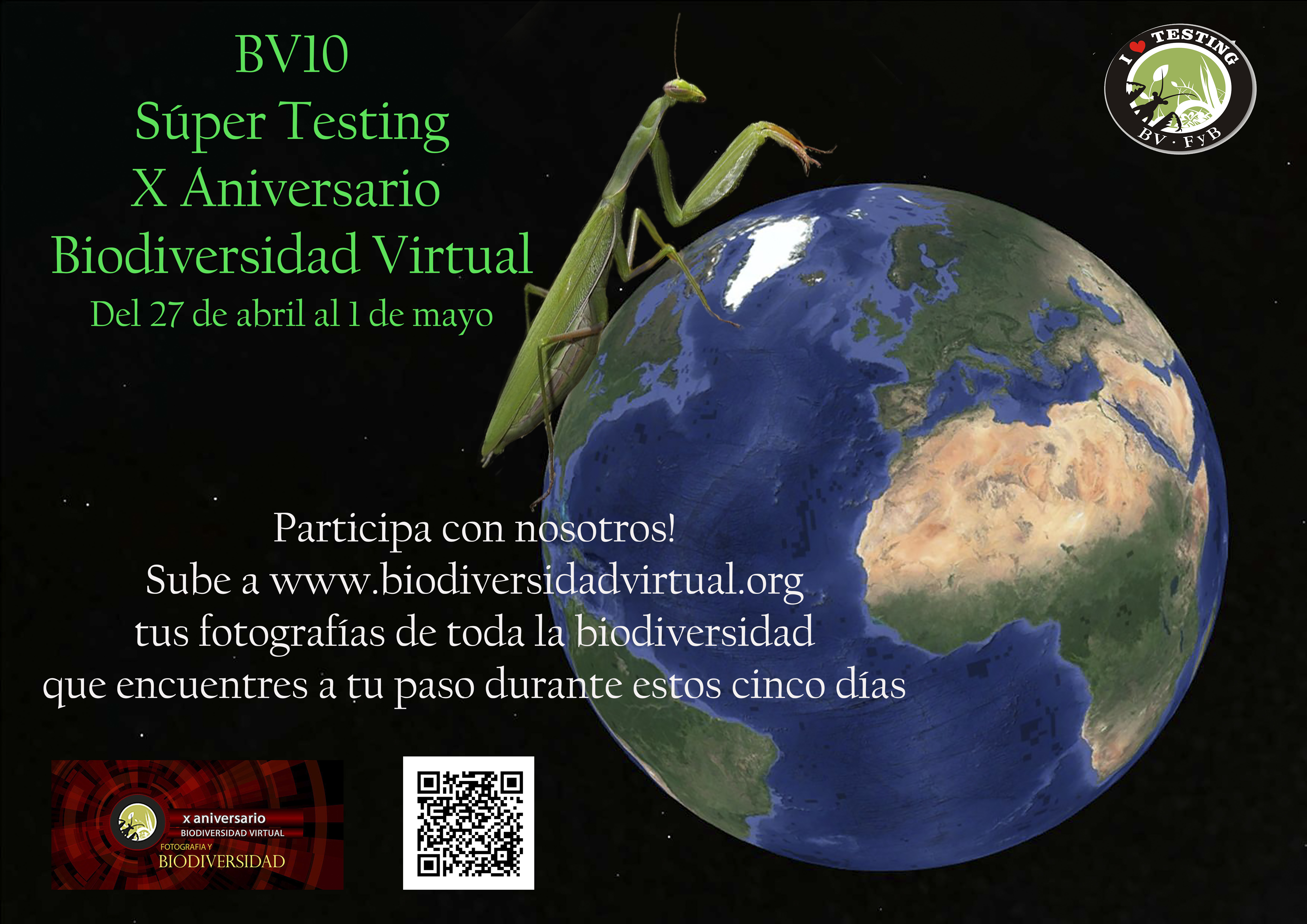 Desde Biodiversidad Virtual quieren hacernos a todos partícipes de la gran fiesta de la ciencia ciudadana por la  biodiversidad  que han bautizado como: Supertesting BV10 y que se celebrará del 27 de abril al 1 de mayo de 2018 en todos los rincones de la península ibérica e islas.